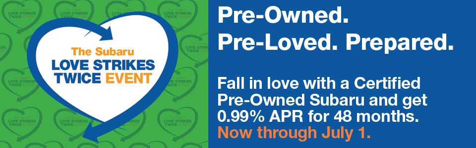 It's the last week of the Subaru Love Strikes Twice event so be sure to come see us if you've got a used Subaru in mind for your next car. Until July 1, you can receive as low as 0.99% APR for the first 48 months.