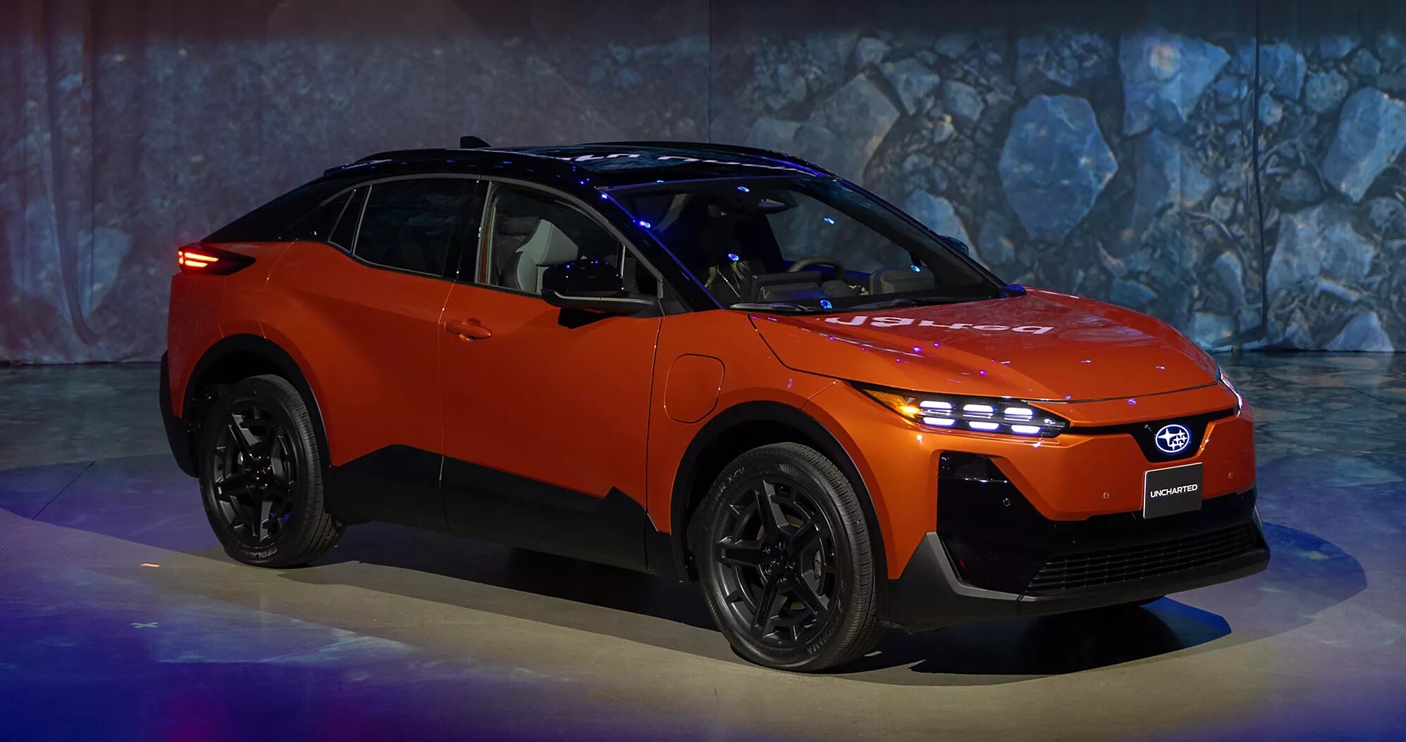 While more compact than the Solterra, the Uncharted offers more cargo space behind the rear seats and a tighter turning radius similar to the Crosstrek, making it well-suited to navigating tight parking lots and narrow neighborhood streets. A strong chassis, balanced suspension tuning, and a low-mounted battery pack contribute to poised handling and a settled, confident ride, whether you're commuting across town or traversing gravel backroads. Bold LED lighting, available two-tone paint, and an illuminated six-star Subaru badge give the Uncharted a distinctive look, while low-profile roof rails add useful utility for transporting bikes, kayaks, or camping gear.